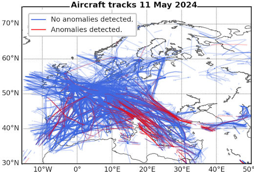 AIRPLANES MISPLACED DURING A GEOMAGNETIC STORM: A new study published in Space Weather suggests that flying during an extreme geomagnetic storm may not be a great idea. During the superstorm of May 10-13, 2024, disturbances in Earth’s ionosphere disrupted GPS tracking systems for airplanes flying over Europe. Some planes briefly appeared hundreds of kilometers from their true locations.