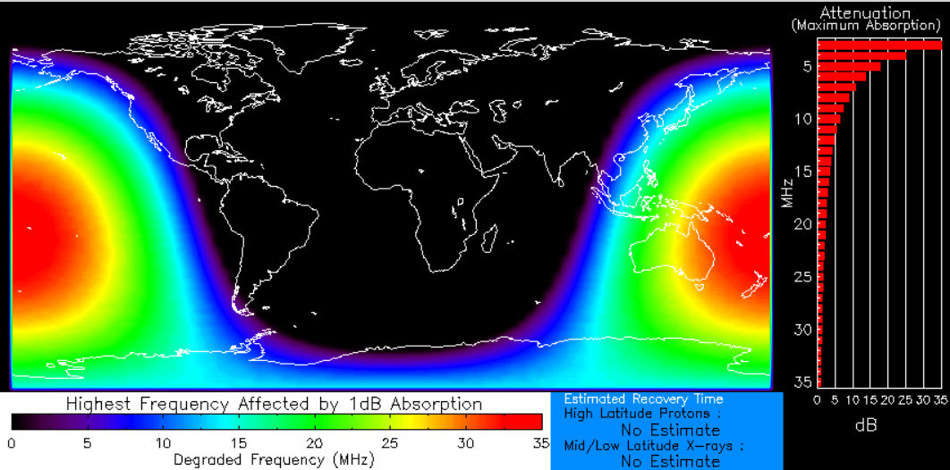 Extreme ultraviolet radiation from the flare ionized the top of Earth's atmosphere. This, in turn, caused a shortwave radio blackout across the South Pacific Ocean: blackout map. Ham radio operators in Australia and New Zealand may have experienced loss of signal below 30 MHz for hours after the flare's peak.